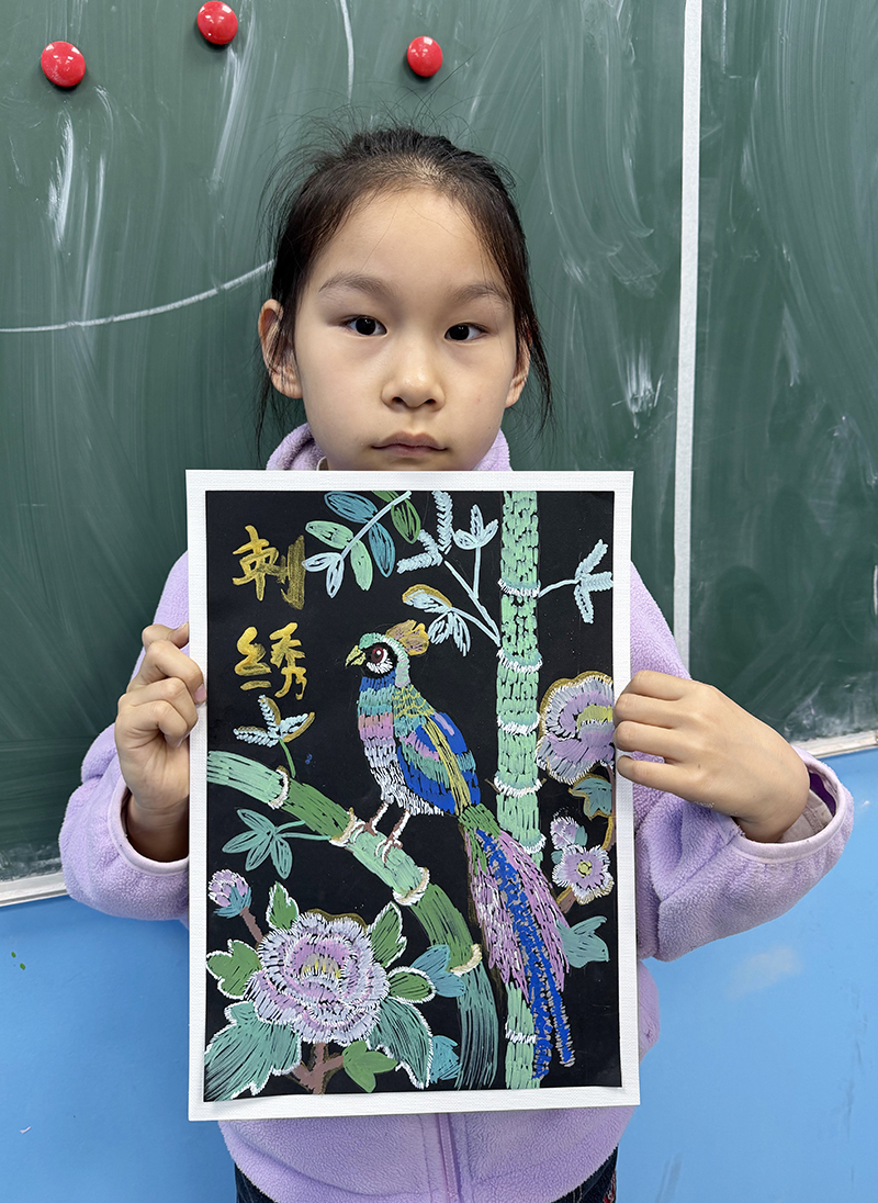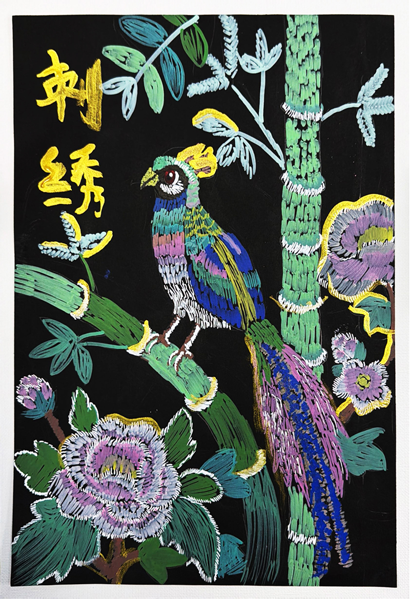 王子容:8歲 畫齡:3年 作品名稱:《刺繡》 指導(dǎo)老師:嶗山大拇指教學(xué)基地——鐘甜