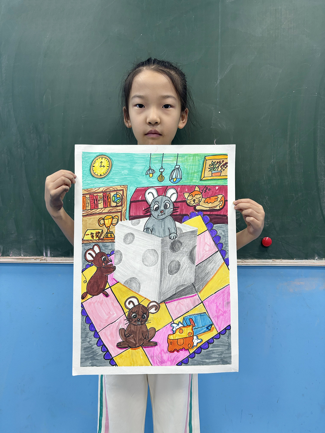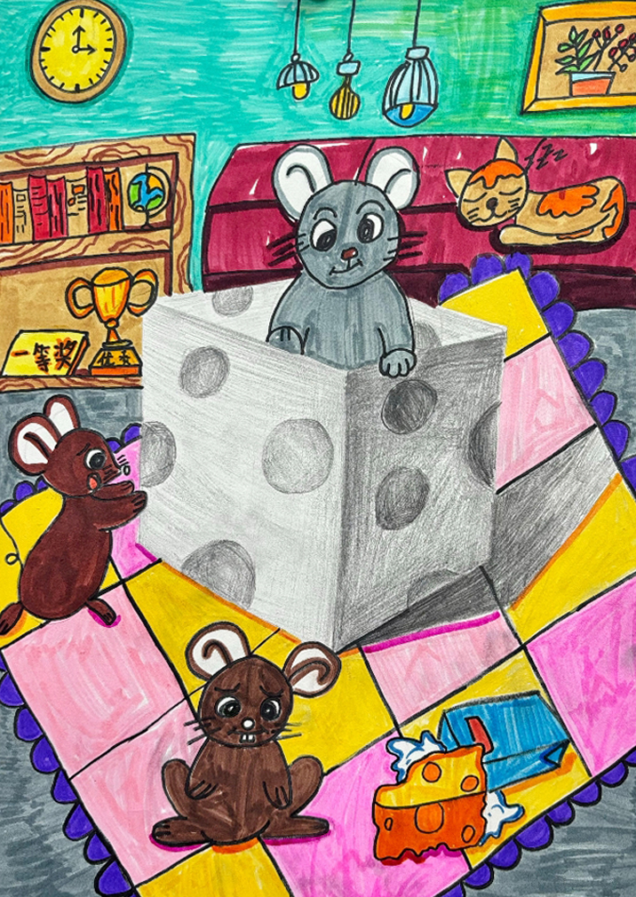 姚盛熙:9歲 畫(huà)齡:1年 作品名稱(chēng):《誰(shuí)動(dòng)了我的奶酪》 指導(dǎo)老師:嶗山大拇指教學(xué)基地——趙蕾