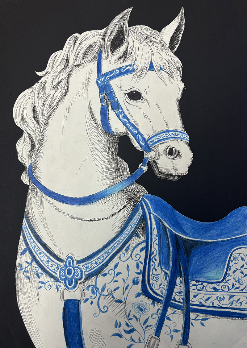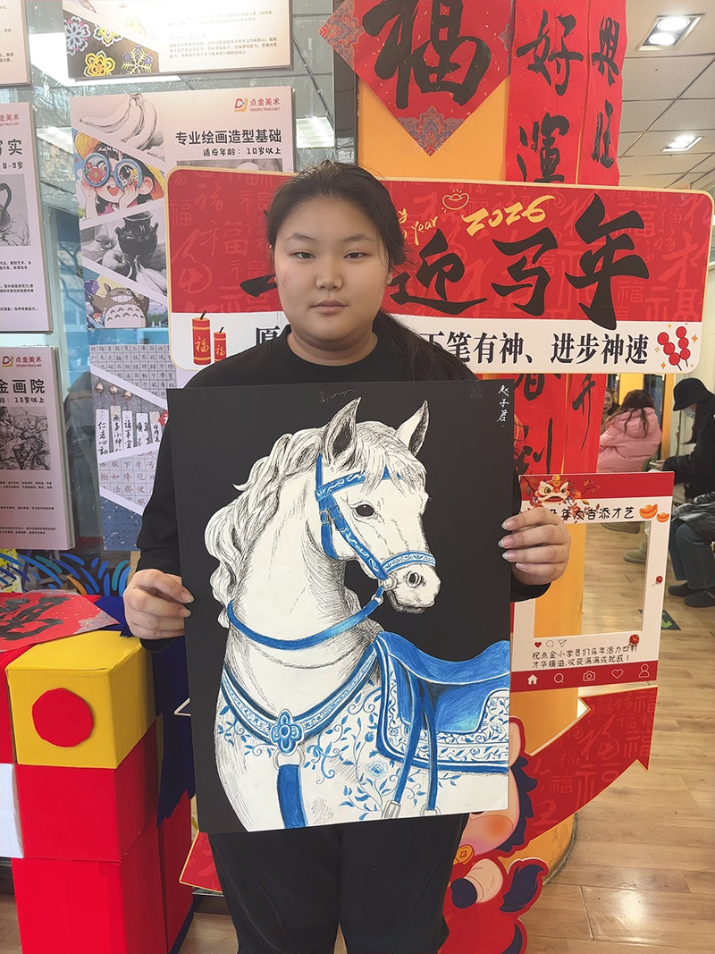 趙子君:13歲 畫齡:5年 作品名稱:《青花照夜白》 指導(dǎo)老師:四方教學(xué)基地——鐘甜