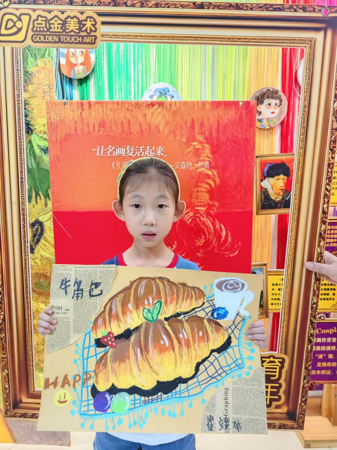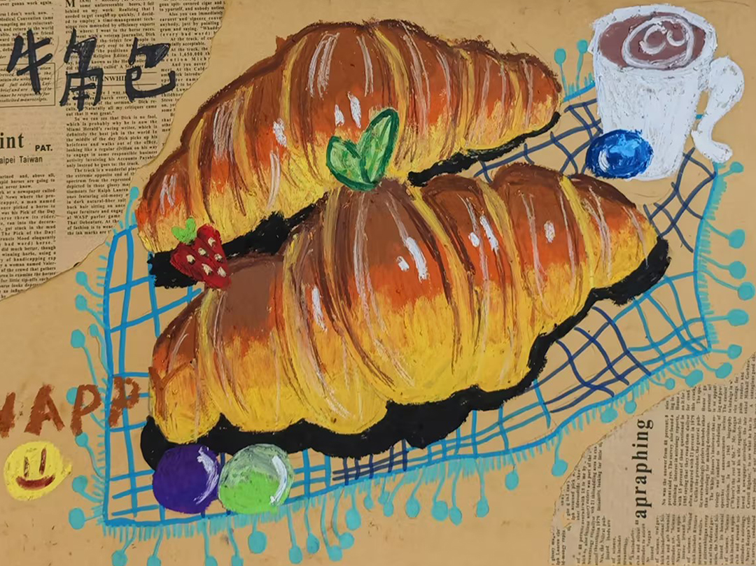 崔竣婷:8歲 畫齡:1年半 作品名稱:《美味的牛角包》 指導(dǎo)老師:四方杭州路教學(xué)基地——厲燕