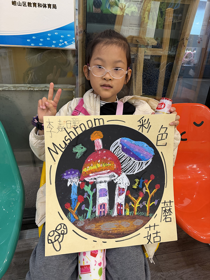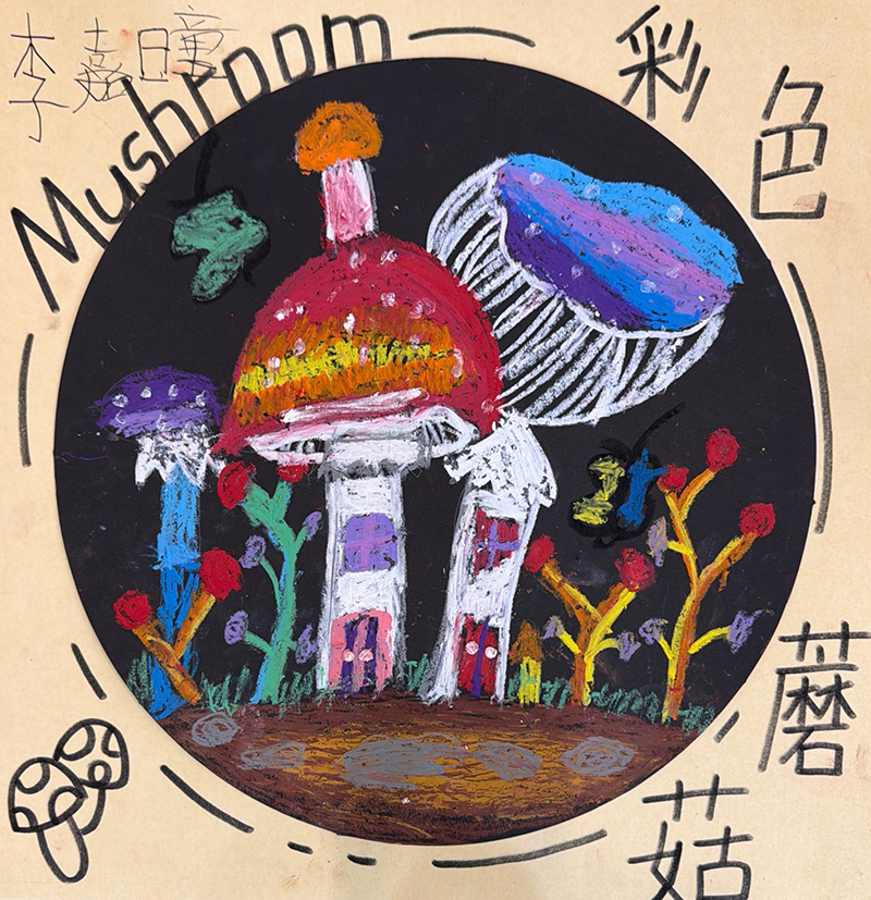李嘉曈:6歲 畫齡:1年 作品名稱:《彩蘑菇》 指導老師:嶗山大拇指教學基地——趙蕾