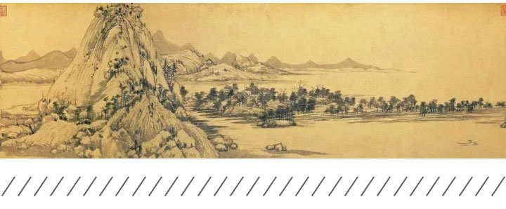 《富春山居圖》所采用的是一種橫卷的方式,按照人的正常視野,構(gòu)造了同一水平上的山水景色,是一種從平面上不斷進行延伸的構(gòu)圖方式。在畫面上,畫家進行了山水的層次感設(shè)計,山的前后是一種由近到遠(yuǎn)的排列,在構(gòu)圖方式上給予了前后景物的一種有效聯(lián)系。