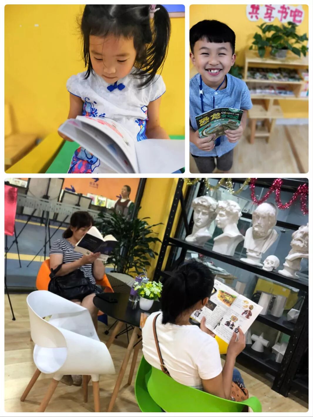 9月1日“共享書吧”落成并投入使用,書吧內(nèi)所有圖書均可在校區(qū)免費(fèi)閱讀,開放首日就受到了家長們的好評(píng)和學(xué)員們的喜愛。陪同孩子們上課的家長們紛紛放下手機(jī),拿起圖書,利用陪伴和等待的碎片化時(shí)間補(bǔ)充知識(shí);等待上課的孩子們也興致盎然的拿起圖書,三兩一組在書上比劃著,小聲的討論著什么,不時(shí)發(fā)出嬉笑的聲音,畫面好不和諧。