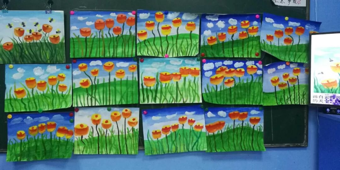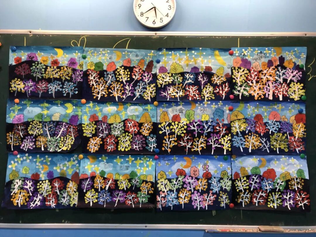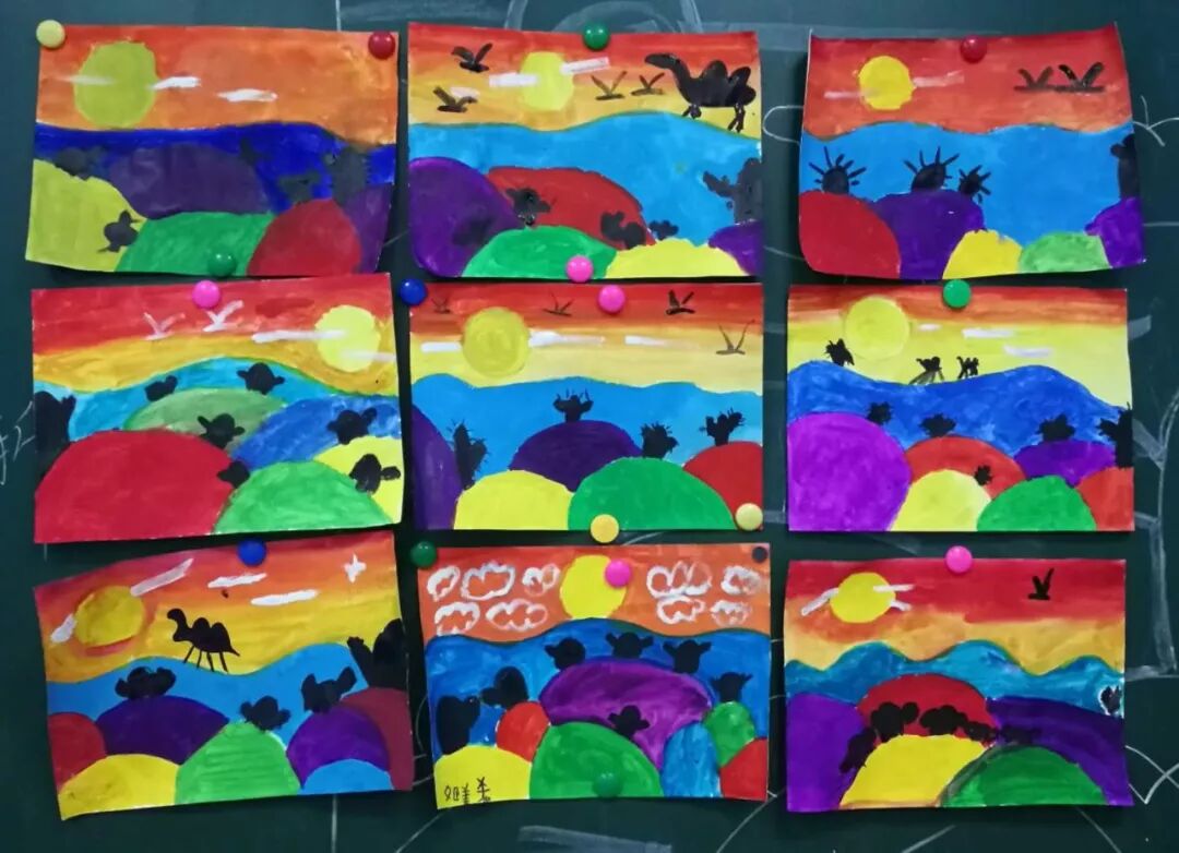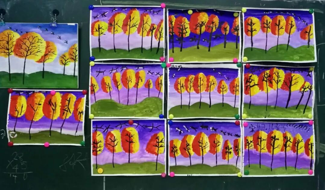 從《迷人的秋天》、《長(zhǎng)河落日》、《萬(wàn)紫千紅》、《開(kāi)滿花的大樹》、《明年再來(lái)》、《草原上的郁金香》,到《迷人的秋天》,通過(guò)對(duì)秋景的描繪,孩子們體會(huì)到了“藝術(shù)源于生活”的真諦,讓自然與藝術(shù)交匯,讓繪畫和秋天來(lái)了一場(chǎng)美麗的相遇。