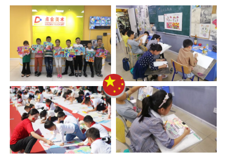 為培養(yǎng)孩子們愛國、愛家的情感,激發(fā)學(xué)生們感受美、表現(xiàn)美、創(chuàng)造美的興趣,帶領(lǐng)孩子們體驗自由表達(dá)和創(chuàng)造的快樂,陶冶藝術(shù)情操,提升國慶的節(jié)日氣氛,在祖國母親70華誕來臨之際,點金美術(shù)特開展“盛世華誕,童心筑夢”、“祖國在我心,童畫中國夢”、“我愛您——祖國”、“喜迎國慶,童繪未來”等國慶主題活動,通過組織特色繪畫活動及營造濃郁的校園節(jié)日氛圍,向偉大祖國真情告白。