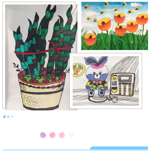 張家睿:一個安靜乖巧認(rèn)真的小姑娘,畫畫的時候總是安靜聽著老師講的要點。在點金美術(shù)學(xué)習(xí)一年,老師發(fā)現(xiàn)你的作品越來越嚴(yán)謹(jǐn)有序,畫面色彩斑斕,對畫面的把控力也越來越好。希望你能享受繪畫所帶來的快樂,未來的你,繪畫道路越走越寬,愿我的陪伴和引導(dǎo)能助你一臂之力。