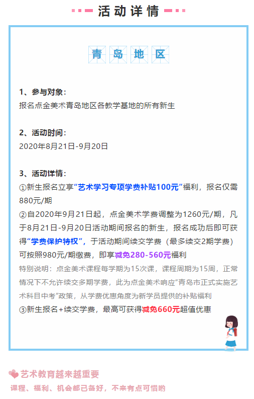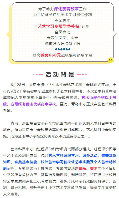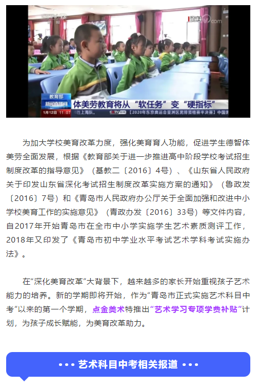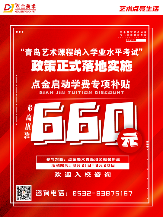 青島市正式實(shí)施藝術(shù)科目中考!點(diǎn)金美術(shù)660元學(xué)費(fèi)專(zhuān)項(xiàng)補(bǔ)貼計(jì)劃全面啟動(dòng),助力“深化美育改革”工作
