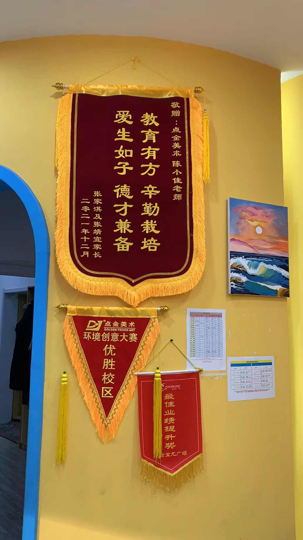 張靖宜、張家淇姐弟兩個都是點(diǎn)金美術(shù)的學(xué)員,都在陳小佳老師班上學(xué)習(xí)。媽媽說“弟弟的年齡比較小,性格上比較調(diào)皮,之前我們也在其他地方試聽過,效果也不太好。但是到了小佳老師這邊,通過小佳老師的不斷鼓勵,孩子變得特別聽話,在美術(shù)方面展現(xiàn)出了特別的天賦和熱愛,給了我們的很大的驚喜?!笔前?,孩子的成長和進(jìn)步時刻牽動著家長的心,也許這一面小小的錦旗,更多的是來自于母親對孩子進(jìn)步的喜悅。