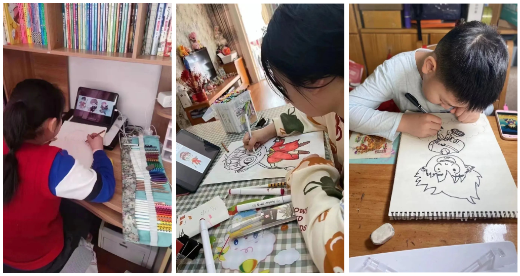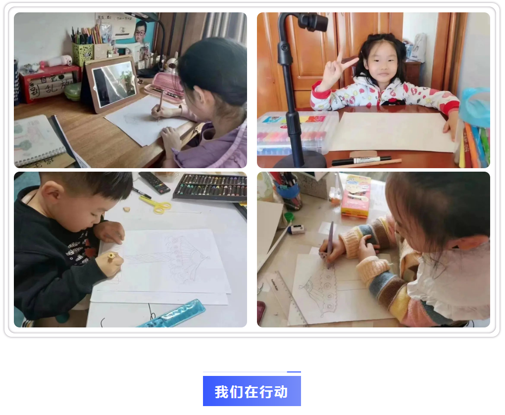 線上公益課程包含創(chuàng)意啟蒙班、暢想啟智班、知藝進(jìn)階班、繪畫空間站、專業(yè)繪畫班,與線下班級(jí)所匹配的課程體系,圖文并茂、結(jié)合視頻生動(dòng)有趣。在此次疫情學(xué)員們居家期間,和盤托出,溫馨呈現(xiàn)。