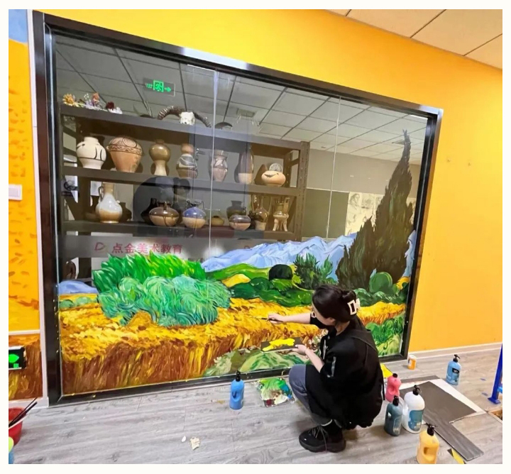 確立主題風(fēng)格、尋找材料素材、定制細(xì)化方案、現(xiàn)場(chǎng)精心繪制。點(diǎn)金美術(shù)各校區(qū)老師們用扎實(shí)的基本功,著力于校區(qū)環(huán)創(chuàng),全力打造一個(gè)充滿(mǎn)樂(lè)趣又不失專(zhuān)業(yè)水準(zhǔn)的藝術(shù)殿堂。
