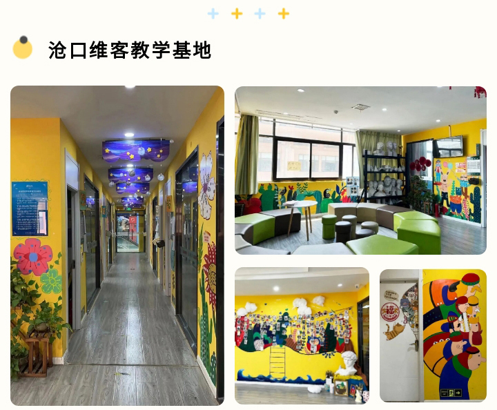 膠南維客校區(qū)門(mén)口以梵高的星月夜為參考,運(yùn)用點(diǎn)彩的方式畫(huà)出旋轉(zhuǎn)的夜空,藍(lán)黃的撞色突出視覺(jué)效果。校內(nèi)走廊則以愛(ài)麗絲夢(mèng)游仙境為主題,具有超強(qiáng)的故事性,滿(mǎn)足學(xué)員的好奇心和興趣。