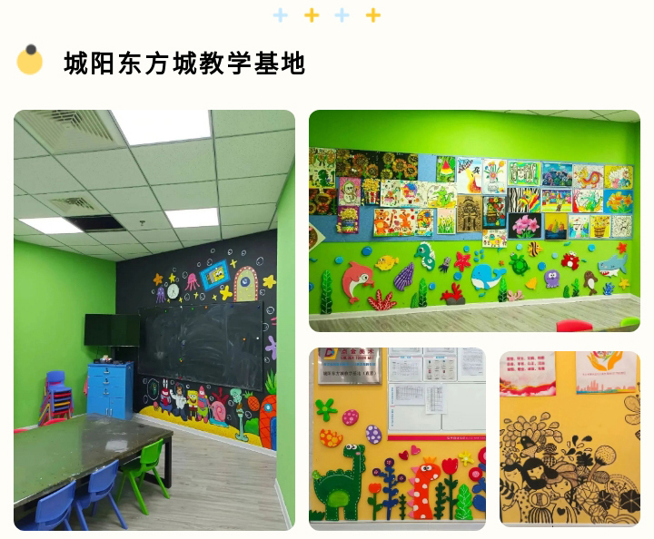 東方城校區(qū)前臺(tái)右邊區(qū)域制作了色彩鮮明的立體小恐龍;啟蒙第一教室制作了啟蒙材料展示墻,讓家長(zhǎng)及學(xué)員清楚的知道美術(shù)課程材料的豐富性;第二教室采取與黑板相呼應(yīng)的海洋主題立體墻繪;素描班級(jí)外面的墻采用了黑白線(xiàn)描,給人感覺(jué)沉著穩(wěn)重,與兒童畫(huà)教室形成鮮明對(duì)比。