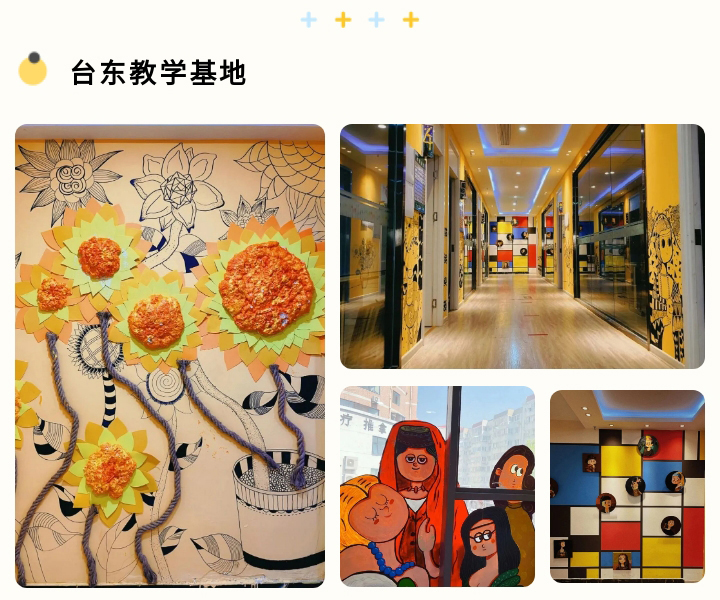 臺(tái)東校區(qū)將大師油畫(huà)作品變成黑白線(xiàn)描形式,與校區(qū)蒙德里安墻面進(jìn)行統(tǒng)一,匯總成一個(gè)富有大師氣息的長(zhǎng)廊。前臺(tái)門(mén)口角落擺放維納斯雕像及綠植做造景,落地窗采用Q版大師作品增添藝術(shù)氛圍。
