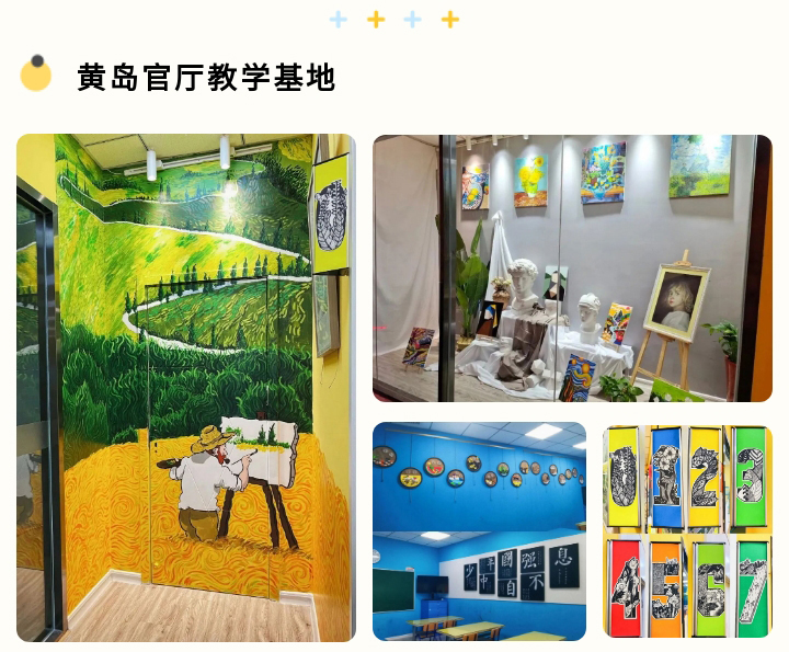 黃島官?gòu)d校區(qū)環(huán)創(chuàng)主題分為“小小美術(shù)館”、“你好!大藝術(shù)家們”、“少年中國(guó)自強(qiáng)不息”三大板塊。“小小美術(shù)館”利用校區(qū)櫥窗根據(jù)主題做環(huán)創(chuàng)的更換;“你好!大藝術(shù)家們”為墻體繪制卡通藝術(shù)家形象,為學(xué)員們介紹藝術(shù)家,讓學(xué)員們更加了解不同的藝術(shù)家和藝術(shù)風(fēng)格;“少年中國(guó)自強(qiáng)不息”結(jié)合書(shū)法,弘揚(yáng)中華文化。