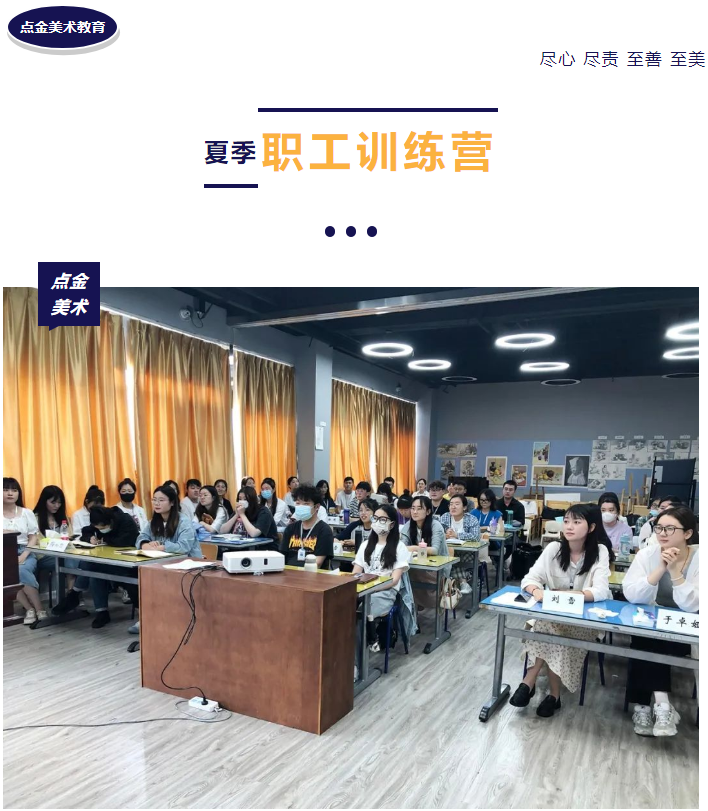 授人魚,不如授人以漁。相信通過這次的夏季職工訓(xùn)練營(yíng),可以幫助新晉教師們對(duì)于未來的工作與發(fā)展持有更多的信心,更快的融入工作環(huán)境,適應(yīng)工作崗位,增強(qiáng)歸屬感,更好的融入點(diǎn)金美術(shù)大家庭。