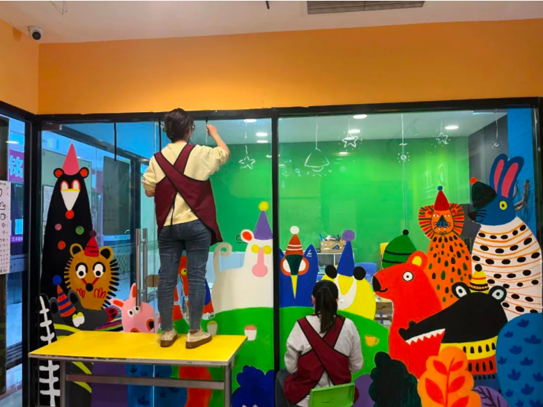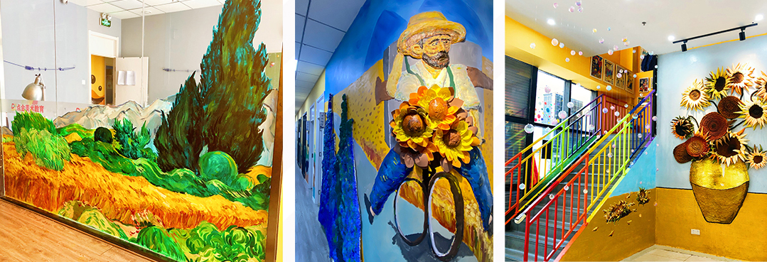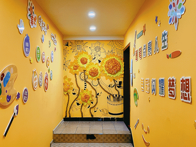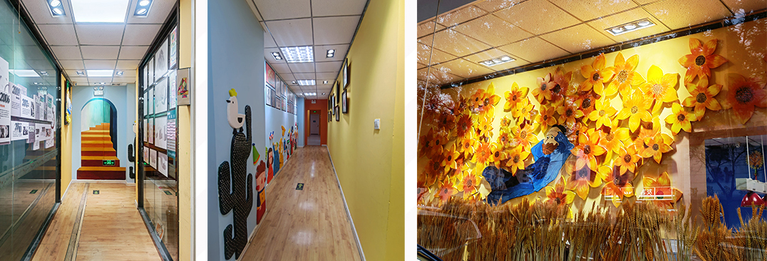 環(huán)創(chuàng)設(shè)計(jì)充分結(jié)合了校區(qū)自身特點(diǎn),大幅度改善現(xiàn)有教學(xué)環(huán)境的空間不足,環(huán)創(chuàng)區(qū)域結(jié)構(gòu)設(shè)計(jì)合理、巧妙,同時(shí)運(yùn)用不同元素和色彩的疊加,增強(qiáng)空間感,另陳舊的教學(xué)環(huán)境煥然一新,立體墻繪的設(shè)計(jì)豐富了視覺效果,融入不同材料以及立體造型,與學(xué)員產(chǎn)生互動(dòng)感,體現(xiàn)了校區(qū)環(huán)境的藝術(shù)教育性。