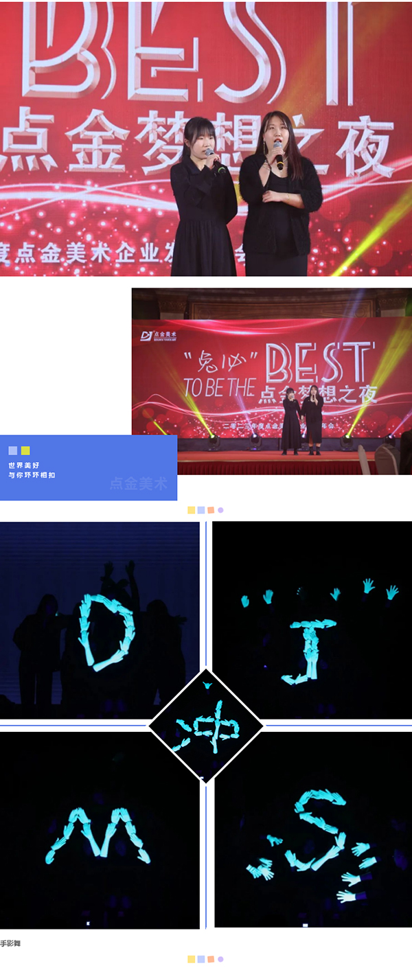 此次點(diǎn)金美術(shù)企業(yè)發(fā)展年會,在麗晶大酒店隆重舉行,分為會議和晚宴兩個(gè)部分進(jìn)行,近300位點(diǎn)金美術(shù)教職員工出席會議。會議總結(jié)2022年的各項(xiàng)工作和整體行業(yè)發(fā)展情況,表彰優(yōu)秀先進(jìn)個(gè)人,明確2023年的企業(yè)發(fā)展目標(biāo)和未來規(guī)劃,為新的一年點(diǎn)金美術(shù)的整體運(yùn)營方向進(jìn)行深度的把控。同時(shí),也給到全體點(diǎn)金人一個(gè)相聚一堂、把酒言歡、載歌載舞的舞臺。
