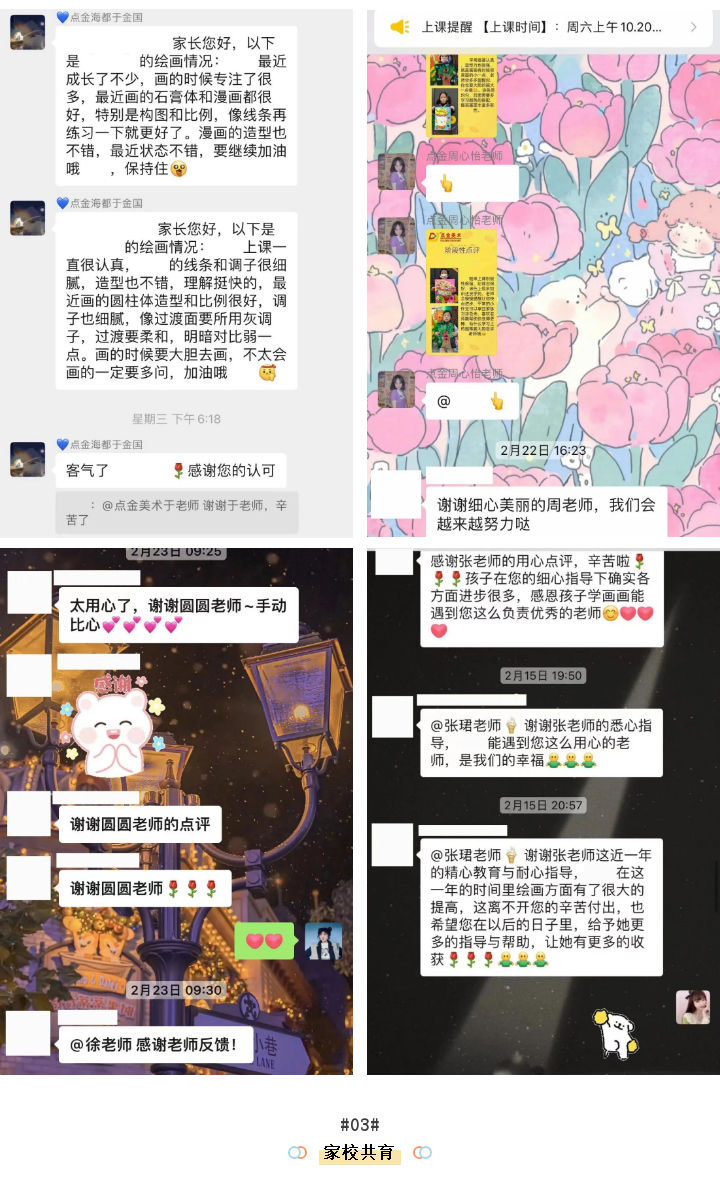 針對(duì)每一堂課程,進(jìn)行課前通知,讓家長和學(xué)員熟知即將要學(xué)習(xí)的內(nèi)容,明晰學(xué)習(xí)進(jìn)度。課后,根據(jù)每個(gè)學(xué)員的課堂表現(xiàn)及情緒變化,進(jìn)行學(xué)員作品、學(xué)習(xí)情況的點(diǎn)評(píng)。從不同維度來優(yōu)化教學(xué)方式。