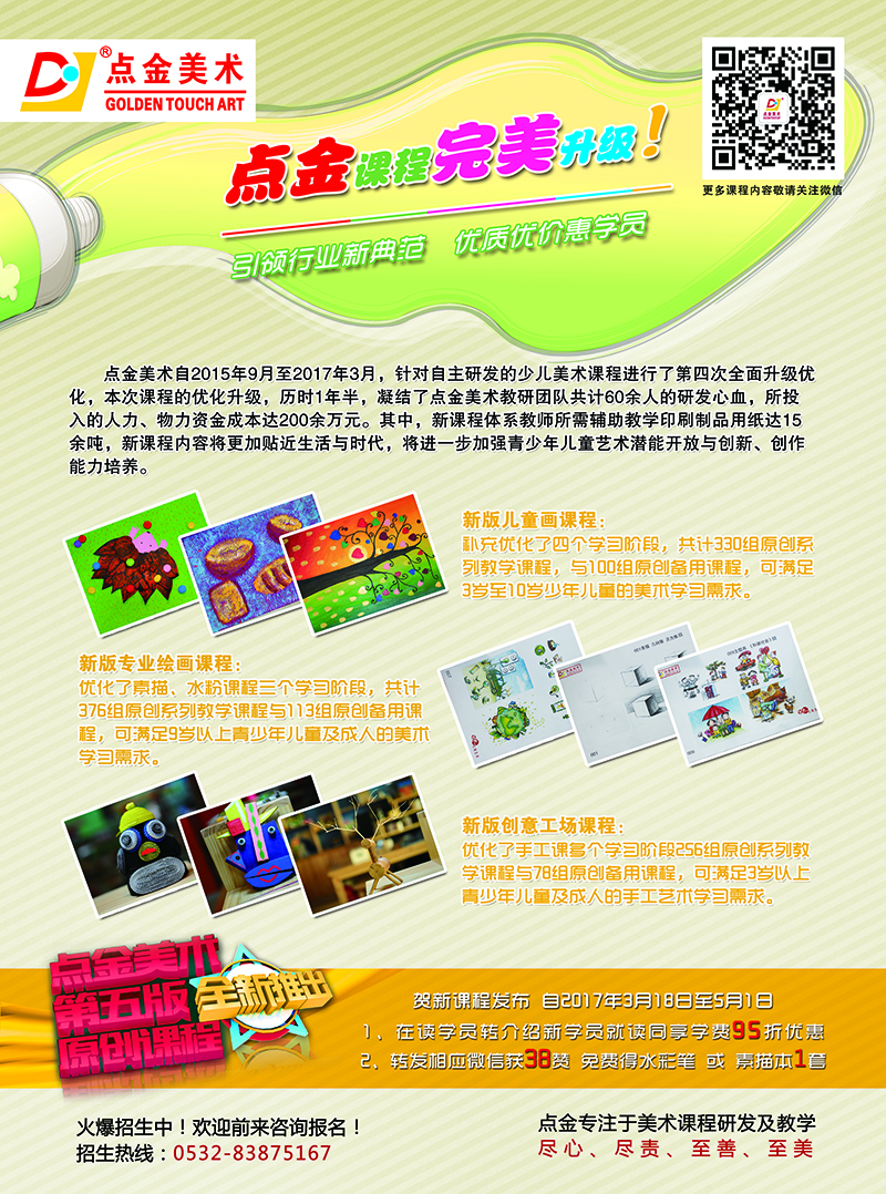 點(diǎn)金美術(shù)自主研發(fā)的先進(jìn)課程體系已獲得學(xué)員及家長(zhǎng)的普遍認(rèn)可。我們?cè)谌〉秒A段性成果之余,仍不忘夯實(shí)自身企業(yè)核心競(jìng)爭(zhēng)力,自2015年9月至2017年3月,依據(jù)國(guó)家全面推進(jìn)素質(zhì)教育政策,結(jié)合十余年美術(shù)教學(xué)研究成果,點(diǎn)金美術(shù)針對(duì)自主研發(fā)的少兒美術(shù)課程進(jìn)行了第四次全面升級(jí)優(yōu)化,踐行教育的與時(shí)俱進(jìn)與開(kāi)拓創(chuàng)新。升級(jí)課程經(jīng)過(guò)點(diǎn)金美術(shù)李滄寶龍教學(xué)基地兩個(gè)月的試運(yùn)行,取得學(xué)員、家長(zhǎng)及社會(huì)各界廣泛好評(píng)。4月15日《點(diǎn)金美術(shù)第五版全新少兒美術(shù)課程體系》即將面向全校發(fā)布,將全面更新現(xiàn)有美術(shù)課程,現(xiàn)將課程升級(jí)情況告知如下: