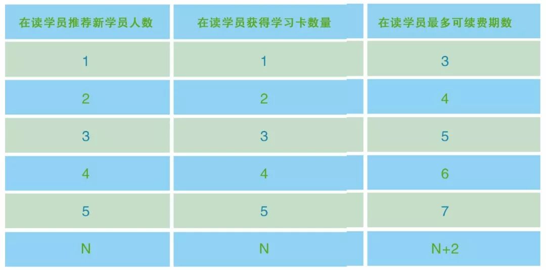 3、新學(xué)員又進(jìn)行多次學(xué)員引薦,則可根據(jù)新推薦人數(shù)獲得相應(yīng)的學(xué)習(xí)卡,折扣相乘累加后(被引薦時(shí)產(chǎn)生折扣不再進(jìn)行累計(jì)),將留作升學(xué)續(xù)費(fèi)時(shí)使用;