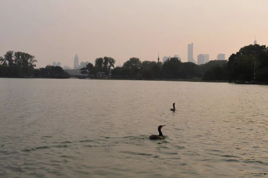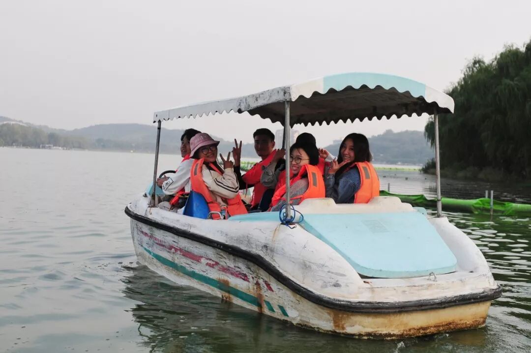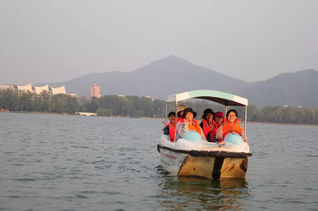 輕波微瀾,撩人神思,耳邊仿佛響起了金戈交鳴和軍士的吶喊。玄武湖在歷史上還曾是古戰(zhàn)場和演兵場,遙想往昔戰(zhàn)云,豪氣頓生。老師們在湖中結(jié)隊泛舟,想象古時景象。