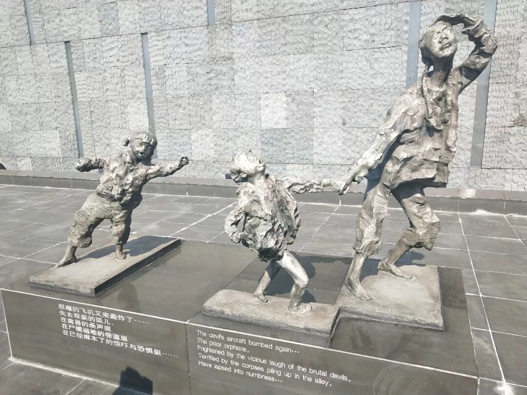 從館外向里走,一路設(shè)置著根據(jù)南京大屠殺做的雕塑,雖然僅是簡單地勾畫,但和文字相配合讓你能夠想象得到當(dāng)時人們所遭受到的苦難。