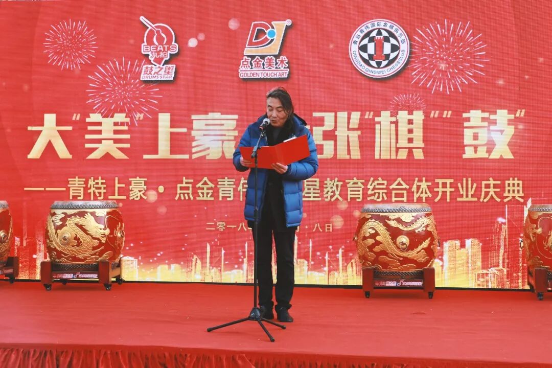 開(kāi)業(yè)儀式在中國(guó)傳統(tǒng)的舞獅表演中拉開(kāi)序幕,具有民族特色的鼓舞演繹與創(chuàng)意十足的鼓配樂(lè)國(guó)象歌訣朗誦伴現(xiàn)場(chǎng)作畫(huà)表演,為現(xiàn)場(chǎng)嘉賓帶來(lái)了一場(chǎng)視聽(tīng)盛宴,教育綜合體代表——青偉國(guó)際象棋俱樂(lè)部總教練 王宏偉先生在儀式上致辭,隨后,在參與儀式的各界嘉賓的共同見(jiàn)證下,完成了點(diǎn)金青偉鼓之星教育綜合體的啟動(dòng)儀式。