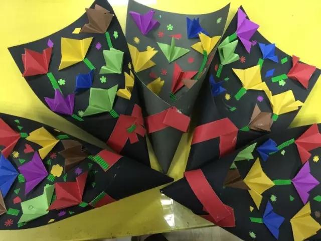 上課之前,老師提前準(zhǔn)備好了不同大小的彩色卡紙供學(xué)生們選擇,同學(xué)們可以根據(jù)自己的喜好挑選顏色制作花朵。同學(xué)們在老師的指導(dǎo)下先將花折好。之后再將折好的花擺放在黑色卡紙上,將花粘到黑色卡紙上。花束的主體做好之后同學(xué)們根據(jù)自己的喜好對花束進(jìn)行裝飾,再用瓦楞紙?zhí)砑由匣ㄖ腿~子。最后將花束卷起來,加上蝴蝶結(jié)裝飾。這樣,一束漂亮的花就做好了。