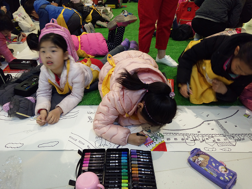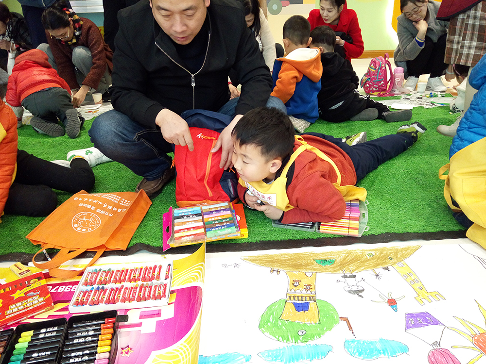 繪畫不分年齡大小,大朋友、小朋友,甚至是陪伴而來的家長們,都童心未泯的加入到了繪畫大軍中,他們大膽想象,盡情創(chuàng)作,默契搭檔,一筆一色落在畫紙上,絢麗的畫卷承載著美好的未來。長卷作品完成后,孩子們、家長們互相欣賞著、交流著,意猶未盡。孩子和孩子,孩子和家長之間,就這樣形成了一條無形卻親密的紐帶。